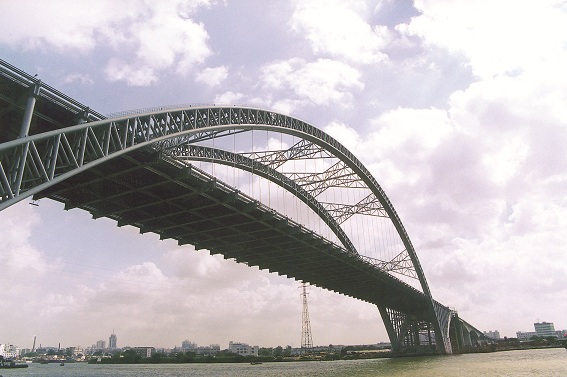廣州市新光大橋——珠江景觀長廊上的新地標,它恰似一只騰飛而起的大雁,又如一道彩虹飛架在珠江上。新光大橋全長1083米,大橋跨越珠江主航道,主墩基礎位于水中,地質條件復雜,水深受潮汐影響顯著。主橋采用177m+428m+177m三跨連續鋼桁拱與混凝土三角剛構的新型組合結構,工程技術難度極大,施工風險極高。徐升橋帶領技術團隊對此種新型橋梁結構的受力原理、關鍵構造以及施工新方法、新工藝等進行了成套技術攻關,經過3年的研究和工程實踐,取得了諸多創新性成果:設計出世界上首座三跨連續鋼桁拱橋與混凝土三角剛構的新型組合橋;提出了“原位臥拼+垂直提升”和“三大段浮運提升”施工方案;找到了利用小型機具實現拱橋大節段安裝的新方法,并評為國家級工法(GJYJGF067-2008),大橋合龍時,這座“巨無霸”的主拱軸線偏差僅為兩個毫米;提出了大型深水基礎不封底單層鋼板樁圍堰施工新工藝,獲得了國家發明專利;降低了施工成本,大橋的鋼結構用量只有18t/m,大大低于同等跨度橋梁,節省鋼材3500噸,采用不封底鋼板樁圍堰技術節省了混凝土8000立方米,節省造價共4600萬元;在不完全斷航情況下僅2天時間便實現了主拱拱肋中段的安裝架設工作,并創造了剛構拱組合跨度、拱肋滑移上船、提升以及拱肋曲梁合龍工藝等世界紀錄。相關發明專利在多座大橋建設中得到成功應用,取得良好的社會效益和經濟效益。新光大橋先后獲得2007年廣州市科學技術一等獎、2007年中國鐵路工程總公司科學技術特等獎以及2008年中國建設工程魯班獎(國家優質工程獎)、第八屆中國土木工程詹天佑獎等榮譽。
