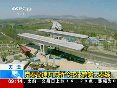 4月16日上午10時,集團公司橋梁院設計的京秦高速公路跨大秦鐵路分離式立交橋成功轉體就位。該橋采用雙幅同步轉體62度跨越大秦鐵路,單幅轉體重量9600噸,單幅轉體長度60+60米。中央電視臺、天津電視臺等多家主流媒體對轉體現場進行了報道。