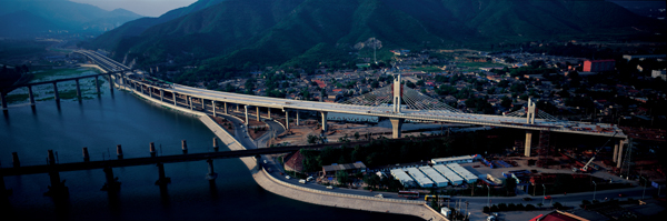 豐沙鐵路轉體斜拉橋位于北京市門頭溝區三家店村,是西六環項目建設中科技含量最高、施工工藝最為復雜、工期最為緊張的控制性工程, 主橋設計為56 +100 +70 +37米四跨連續雙圓柱子母塔單索面W形腹板截面預應力混凝土曲線斜拉橋,橋梁全寬30.5米。結合本橋橋墩較高、體量較大的實際情況,因地制宜地采用了墩頂大噸位單鉸轉體施工工藝,主要技術指標為:墩高21.5米,轉體總長182米,平曲線半徑950米,單鉸轉體重量15000噸,轉體角度40度,是我國第一座采用墩頂轉體施工的橋梁,是世界上墩頂單鉸轉體噸位最大的橋梁。